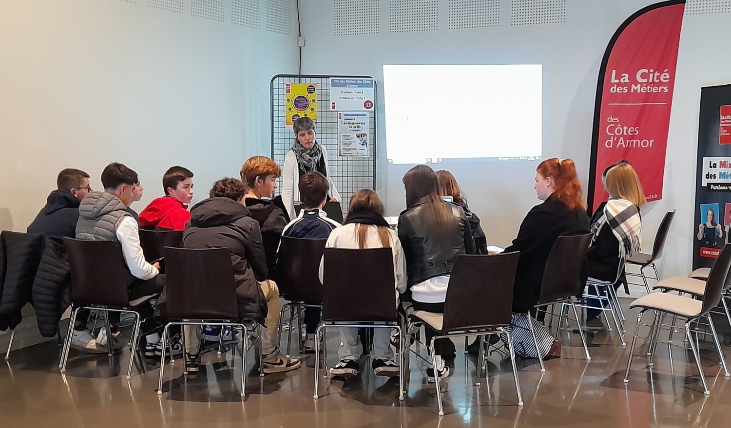 Les élèves de 3e se sont rendus à la Cité des Métiers de Ploufragan jeudi 9 novembre. Ils ont participé à une demi-journée de découverte des métiers et de l’apprentissage. Découverte des métiers de l’industrie, de l’agroalimentaire, de la gendarmerie mais aussi des métiers du soin et des services à la personnes, du bois et de la forêt, du bâtiment ou de l’agriculture. Des ateliers animés par le service communication et l’ensemble des conseillers de la Cité des Métiers et par des représentants des branches professionnelles ou des CFA. Découverte virtuelle des métiers, quiz mixité professionnelle ou apprentissage…